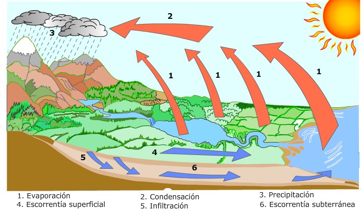 El ciclo hidrologico es un sistema es un sistema mundial gigantesco impulsado por la energia de sol, en el cual la atmosfera proporciona el nexo entre el oceano y los continentes, en el cual los vientos transportan este aire cargado de humedad (a menudo a grandes distancias) hasta que la humedad se condense en nubes y luego caiga en forma de precipitacion, la precipitacion cae en el oceano y asi se completa el ciclo y este esta dispuesto a comenzar de nuevo. ¿Que ocurre con la precipitacion cuando ha caido en el continente? Una parte del agua penetra en el suelo (infiltracion) y se mueve hacia abajo, luego en direccion lateral y por fin rezuma en los lagos, los rios o directamente en el oceano. Cuando la velocidad de la caida de la precipitacion es mayor que la capacidad de absorsion del suelo el agua adicional fluye sobre la superficie en lagos y corrientes (ecorrentias). Gran parte del agua que se infiltra o se escurre acaba por encontrar la manera de volver a la atmosfera por medio de la evaporacion desde el suelo, los lagos y las corrientes ademas una parte del agua que se infiltra en el suelo es absorbida por las plantas que despues liberan ese agua a la atmosfera en un proceso que se denomina "transpiracion".